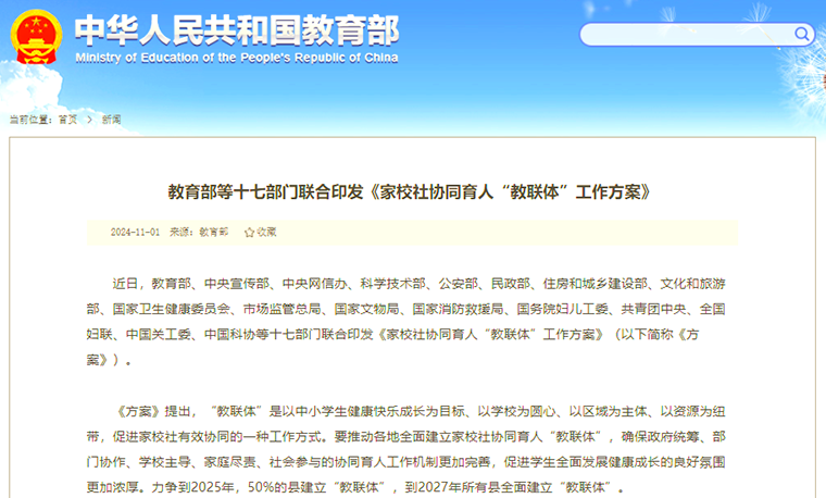 教育部等十七部门联合印发《家校社协同育人“教联体”工作方案》。“教联体”是以中小学生健康快乐成长为目标、以学校为圆心、以区域为主体、以资源为纽带,促进家校社有效协同的一种工作方式。《方案》提出,力争到2025年,50%的县建立“教联体”,到2027年所有县全面建立“教联体”。