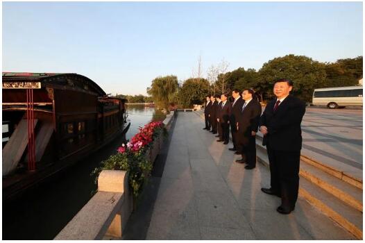 2017年10月31日,习近平带领中共中央政治局常委李克强、栗战书、汪洋、王沪宁、赵乐际、韩正,瞻仰上海中共一大会址和浙江嘉兴南湖红船。这是习近平等在浙江嘉兴南湖边瞻仰红船。