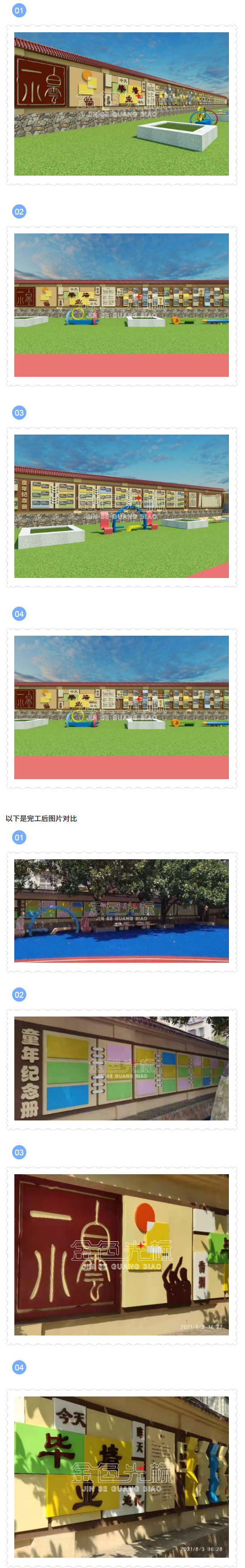 围墙墙壁文化建设是学校对外宣传教育的一道风景线,对外宣传学校办学成果,展示师生风貌;内墙文化可以设置多个版块,如:学习版块、生活版块、休闲版块、运动版块、成果风采展示版块、留言版块等。