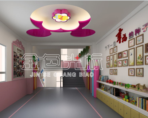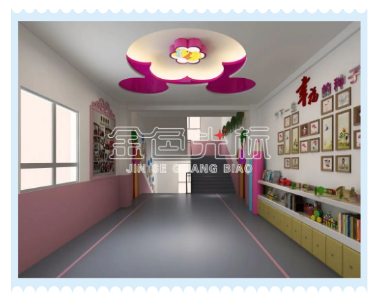 室内过道和楼道文化设计。粉嫩主题彰显孩童纯洁稚嫩气息,形象的顶灯外框造型,形象化且更具生命力。同时采购书柜放置学生用品及书籍,至于墙面,则是用于展示学生风采及校园特色文化。