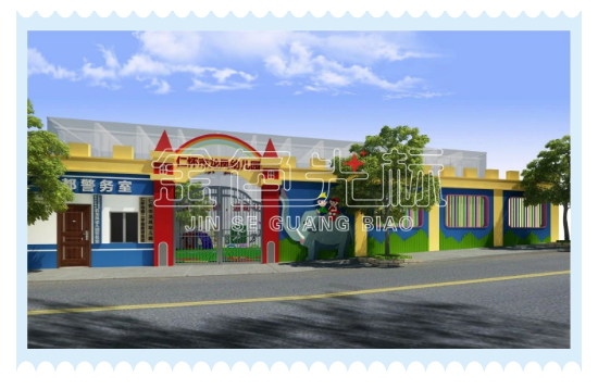 校大门及墙体设计。墙面使用比较明显的图案,颜色搭配还是偏于多样化色彩。用一定比较独特的造型装点校门,在有一定的美观基础上儿童化,突出活力生命力。