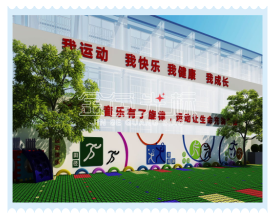 校园楼层横梁标语及操场墙面文化设计。标语采用大红色,常规的行为规范标语,简单易懂。墙面文化使用一些有代表性的运动造型,利用反差较大的颜色搭配,产生一定的视觉冲击,更为突出主题的中心思想。