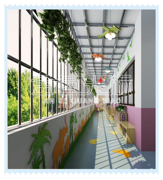 室外走廊整体设计:森林系主题,用绿植装点窗户栏,墙面使用一些动植物造型,颜色搭配以绿色、黄色、粉色为主。同样也采购书柜放置书籍、学生用品和绿植等。