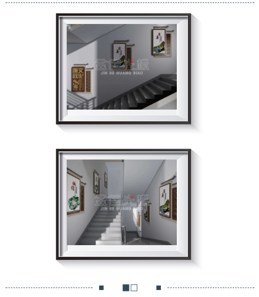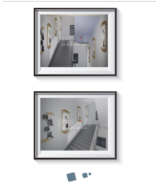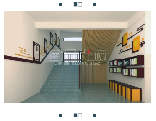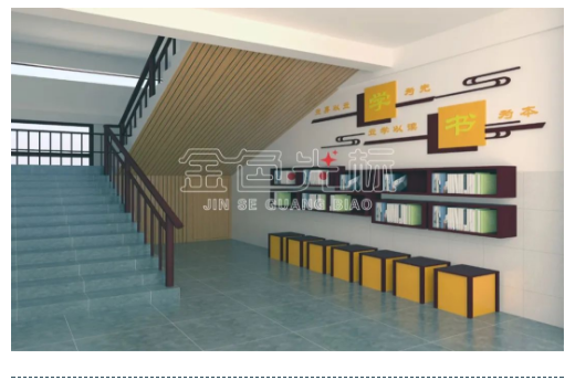 其次,在不影响美观的情况下,合理利用空间。在另一面楼道设计了一处楼道书吧,使楼道不单单只是一处过渡段,而是可停留的学园之地。更是体现了文化无处不在,所谓处处有文化,文化处处学。