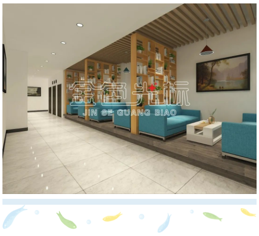 根据学校的地势条件,建筑风格,采用乳胶漆刷墙,蓝色、黄色、灰色,三种色调搭配,赋予墙面生命力,色彩的视觉冲击,打开整体思维,让人没有那么局限性。