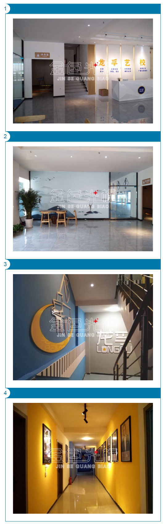 再结合学校的一些培训项目,运用其中一些艺术小造型,使墙面更加丰富多彩。整体效果简约大气,不会让人有压抑感,多彩的颜色搭配,使得心旷神怡,思想开拓。